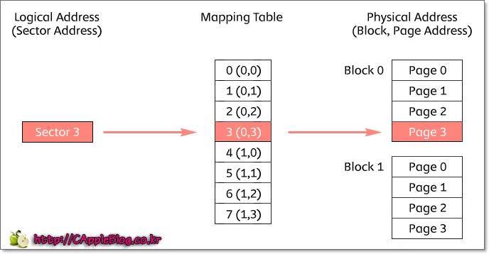 이 메핑 테이블은 페이지 혹은 블록 단위로 저장한다고 한다.