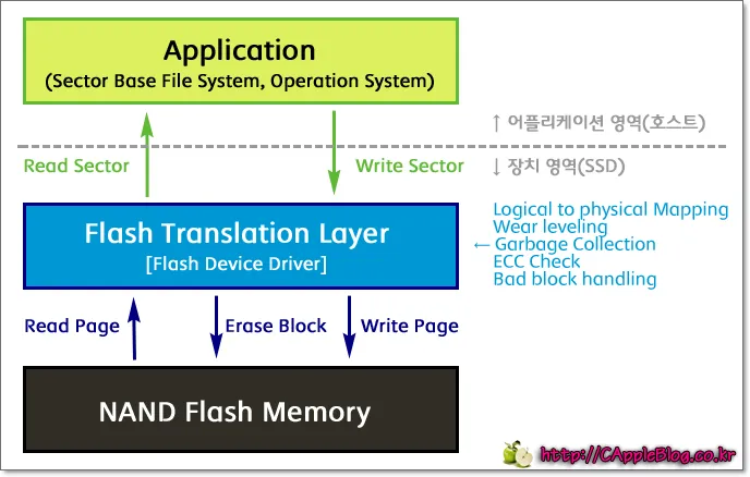 이런 문제를 해결하기 위해서 SSD는 컨트롤러 단계에서 FTL이라는 컴포넌트를 사용해 물리적인 블록과 페이지 위에 논리적인 섹터 구조를 구현하는 방식을 사용한다