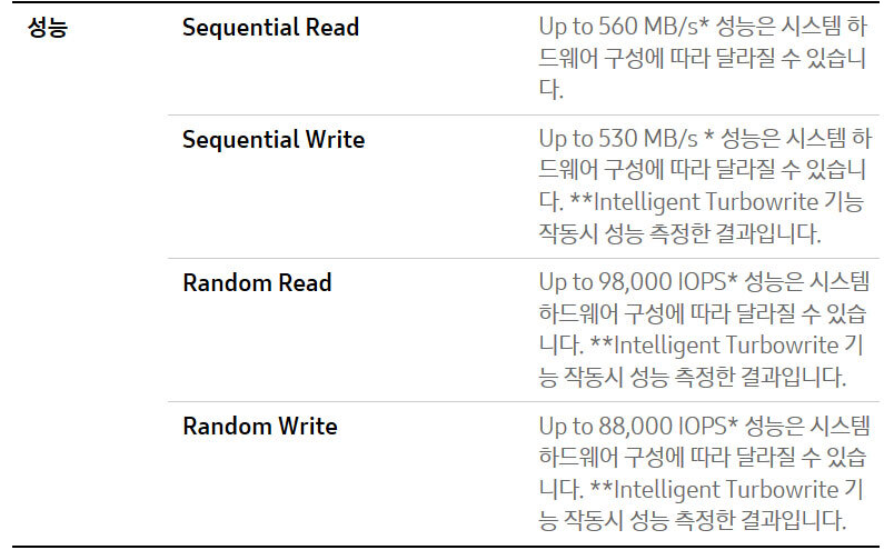 그러면 순차 읽기는 560MB/s 인데 확실히 랜덤 읽기가 느리다는 것을 SSD 성능 지표에서 볼 수 있다.