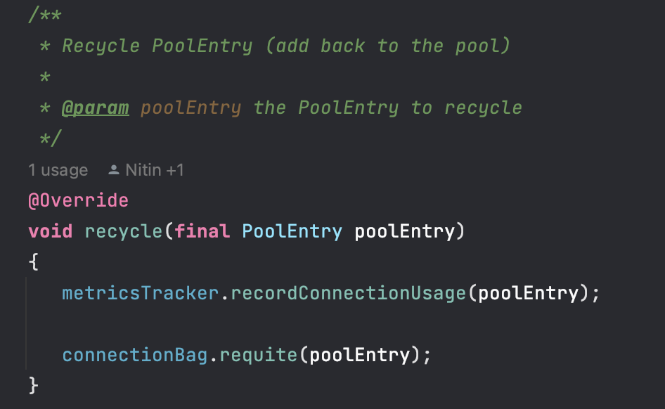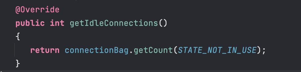 HikariCP에서 IdleConnection은 NOT_IN_USE 상태라는 것을 다음 코드를 통해서 명확히 확인 할 수 있다.