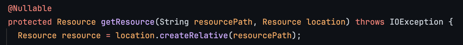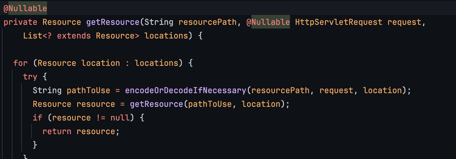 ResourceHttpRequestHandler 의 handleRequest를 타고 가는데 여기서 getResource 함수에서 리소스를 가져오게 된다.